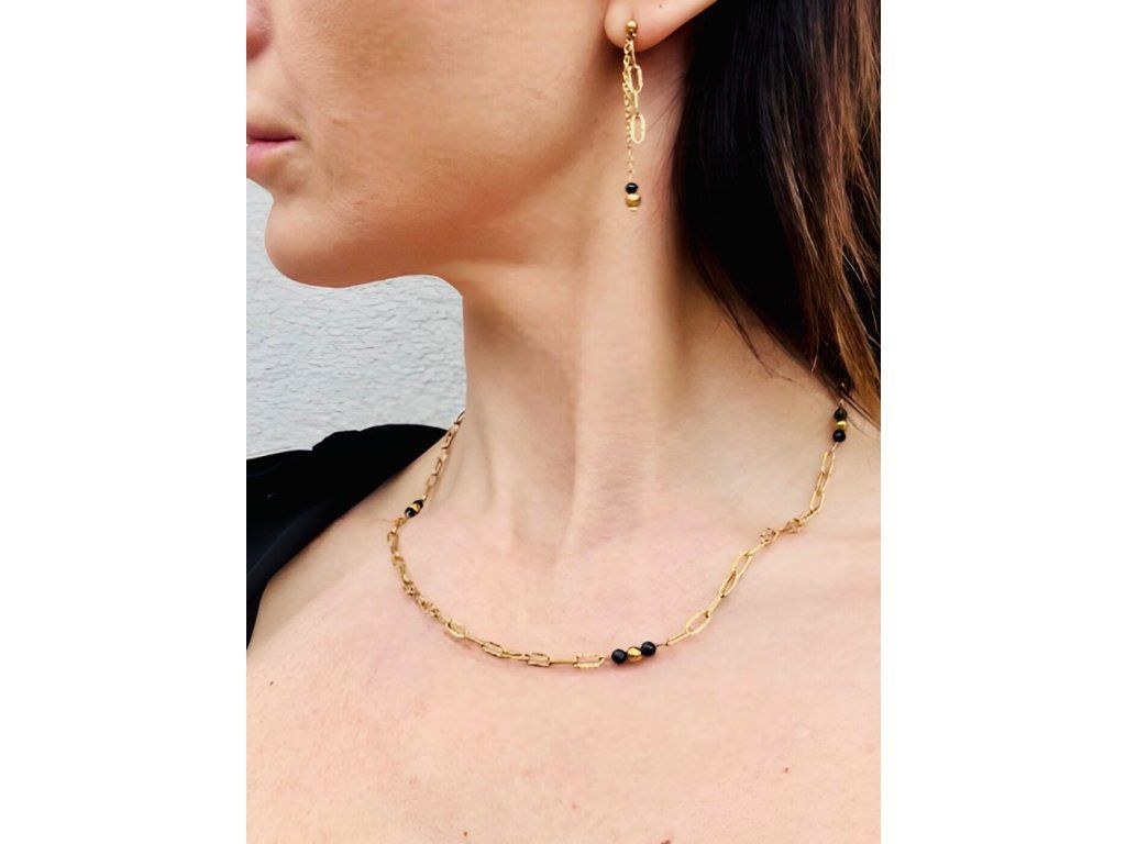 Onyx představuje minerál, který symbolizuje SÍLU, OCHRANU A STABILITU. V kombinaci se strukturovanými zlatými korálky vytváří na řetízku jemné "signature" detaily, které se prolínají všemi šperky z této řady.