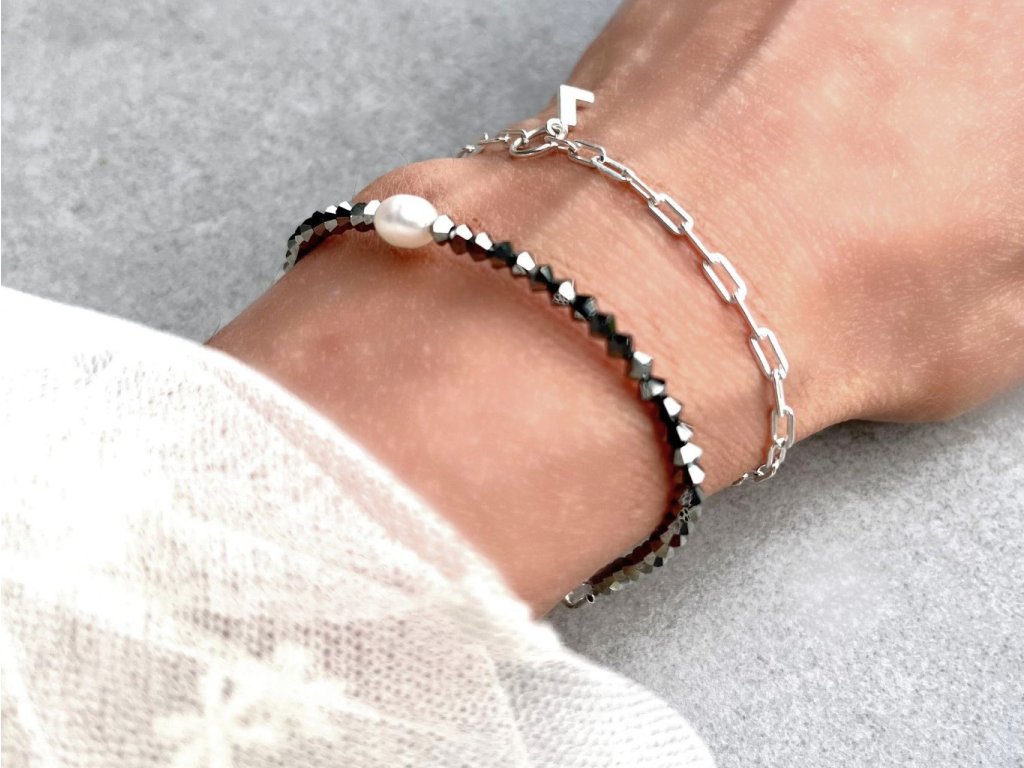 České sklo na vaše zápěstí! Dokonale broušené skleněné korálky Preciosa Bicone ve stylu Hematite kolem do středu umístěné pravé říční perly vytvoří šperk, kterého si všimne opravdu každý!