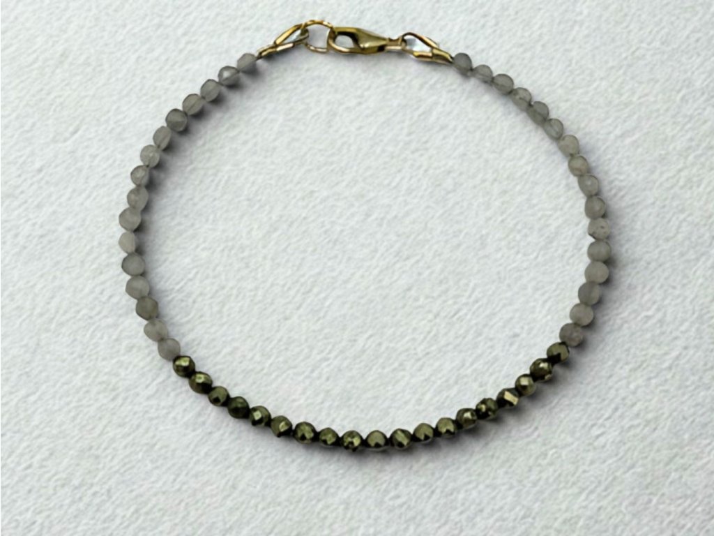 Zářivý lesk pyritu vyvážený decentním odstínem labradoritu. Náramek pro ženy, které milují minimalistický styl s nádechem luxusu.Tyto dva minerály se krásně doplňují nejen esteticky, ale i v symbolické rovině. Oba patří ke kamenům, které blahodárně působí na psychickou pohodu a zdraví.