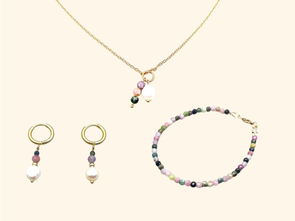 Set šperků VIBRANT HARMONY kombinuje minimalismus, eleganci a hravost. V hlavní roli Turmalín Gradient a říční perly!