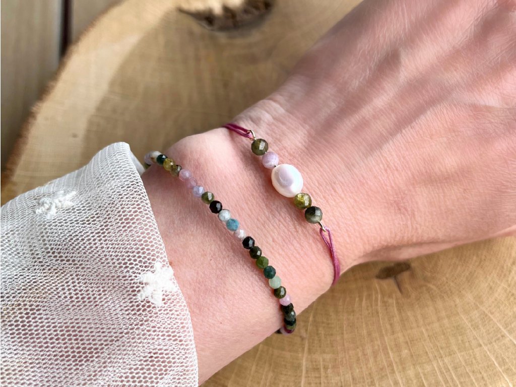 Turmalín a perly. Úžasná kombinace jak na pohled, tak v symbolické rovině. Se starorůžovou šňůrkou tvoří něžný náramek, který maximálně podpoří ženskou energii. Na zápěstí vypadá krásně jak samostatně, tak i v rámci vrstvení.
