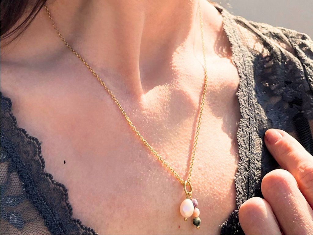 - Údržba a péče: Samotné komponenty, ze kterých je náhrdelník vyroben, jsou voděodolné. Nicméně omezení kontaktu zejména pak s chemikáliemi, chlorovanou vodou, slanou či termální výrazně prodlouží životnost šperku. K leštění používejte suchý hadřík.